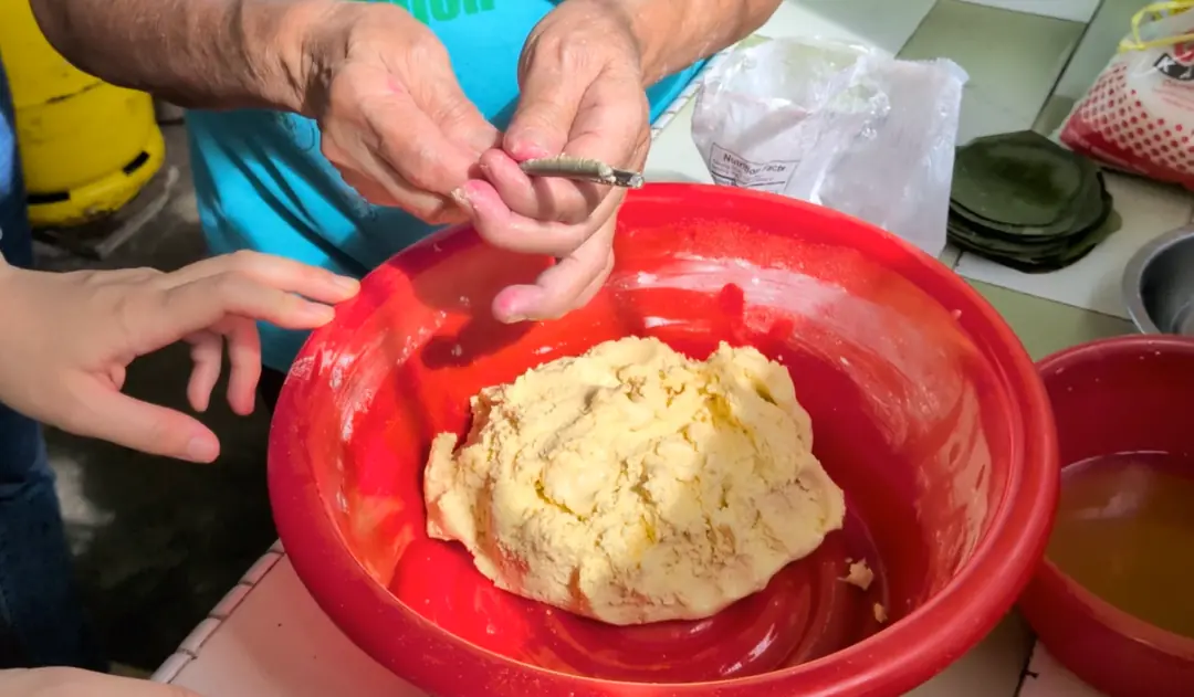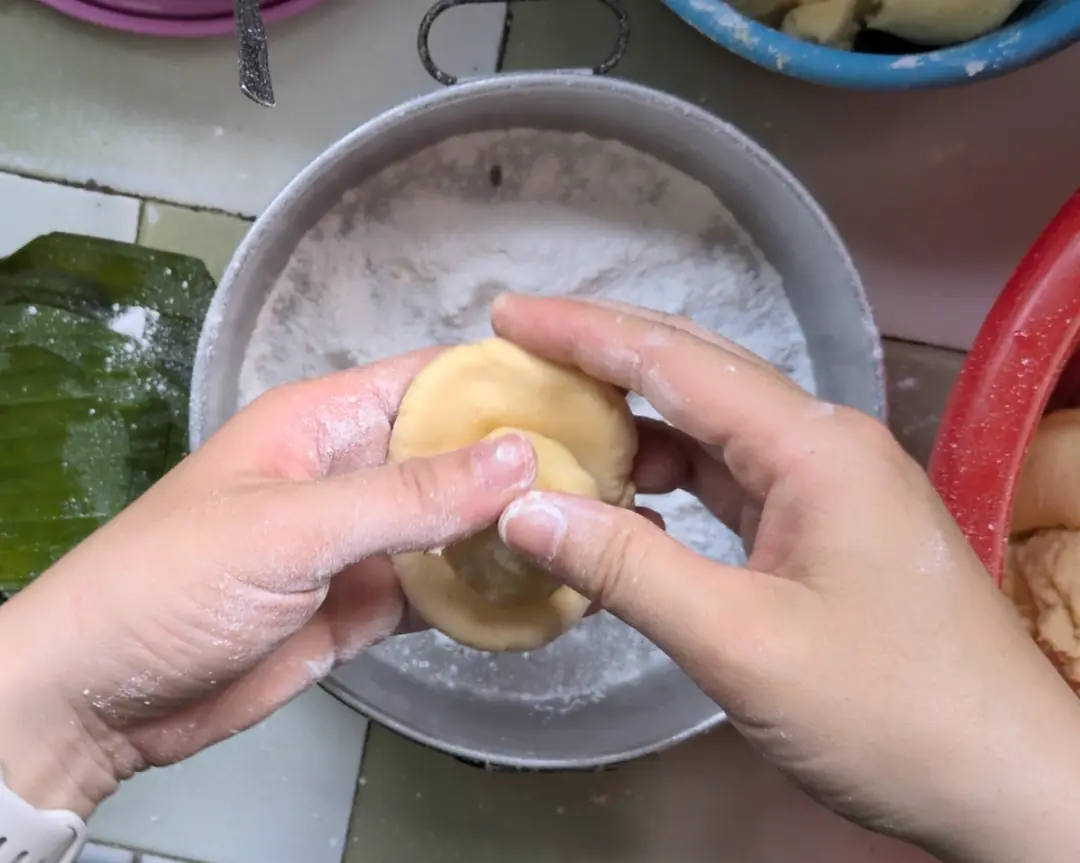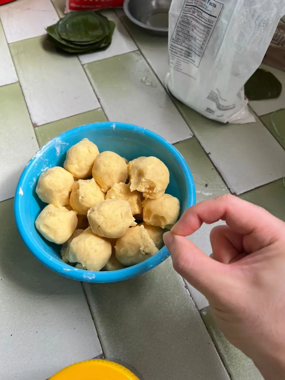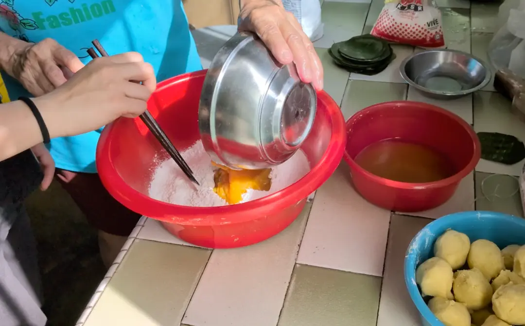If the dough is too wet, balance it out by adding more to the mixture. If too dry, add the '' that you saved previously. Balance until you reach a 'tang yuen-like' consistency.