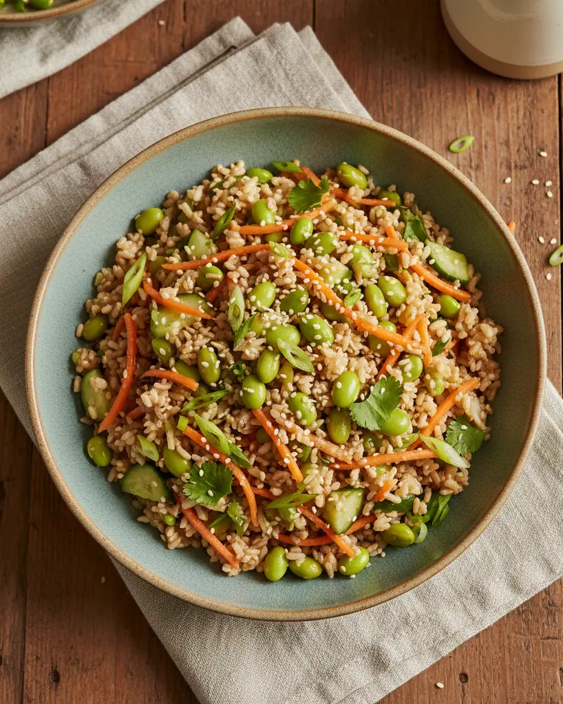 This Edamame and Brown Rice Salad is high in protein and packed with fibre and anti-inflammatory ingredients. It makes a great side with grilled chicken, fish or tofu, or can stand on its own for a quick nutritious lunch with a fried egg and half an avocado.