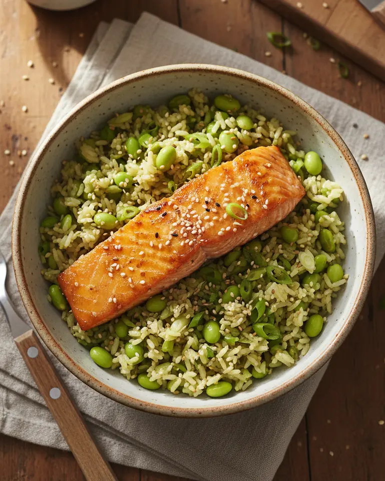 A flavour-packed bowl with miso-glazed salmon, edamame and rice. It’s high in protein, full of healthy fats and fibre, and comes together easily for a balanced weeknight meal.