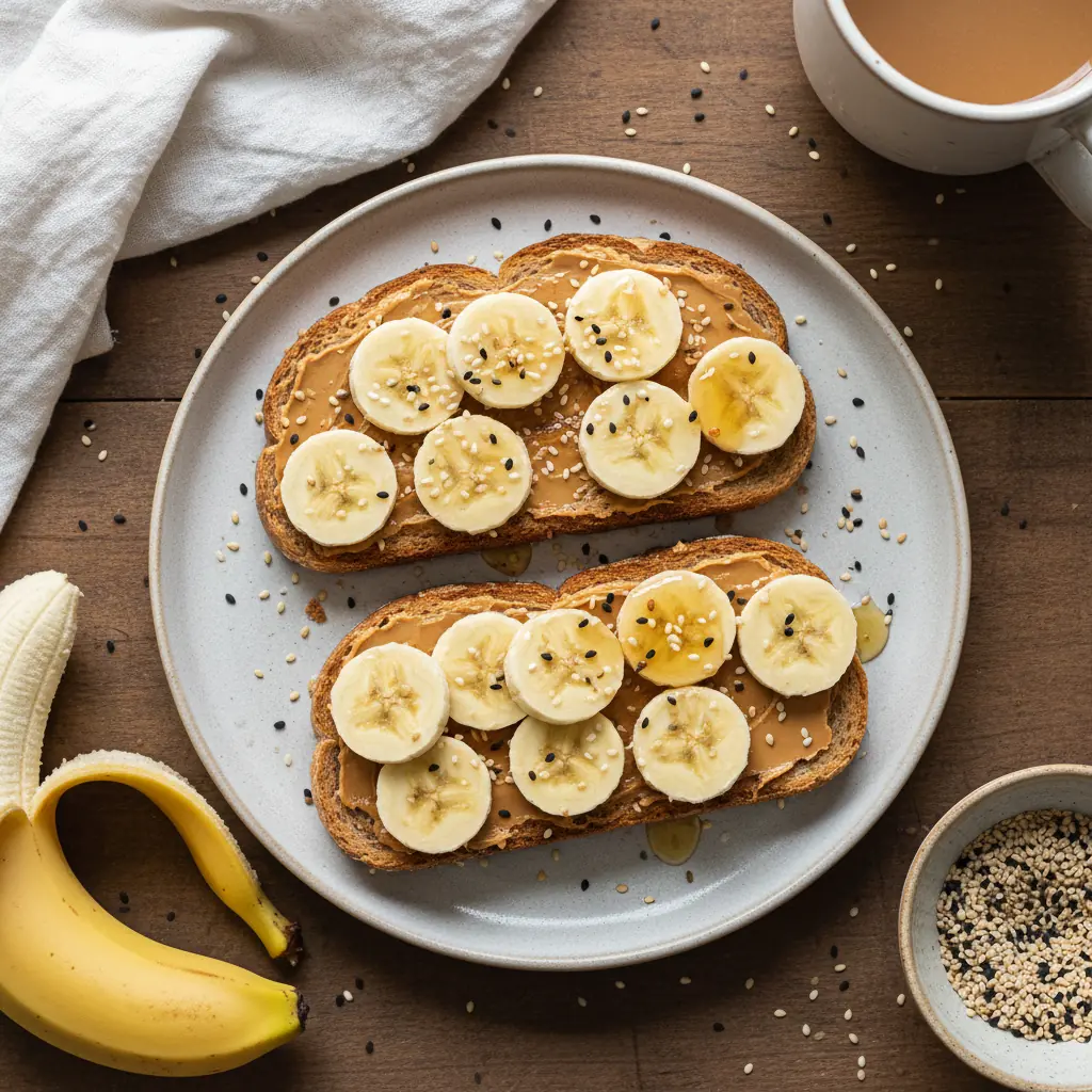 This quick breakfast idea combines creamy peanut butter, fresh banana slices, and crunchy toasted sesame seeds on warm toast. It’s a nutritious and delicious meal with energy from the peanut butter, vitamins from the banana, and a delish nutty crunch from the sesame seeds. Simple to make and satisfying - it’s a great option for a wholesome start to their day or a snack when you need a pick me up.
