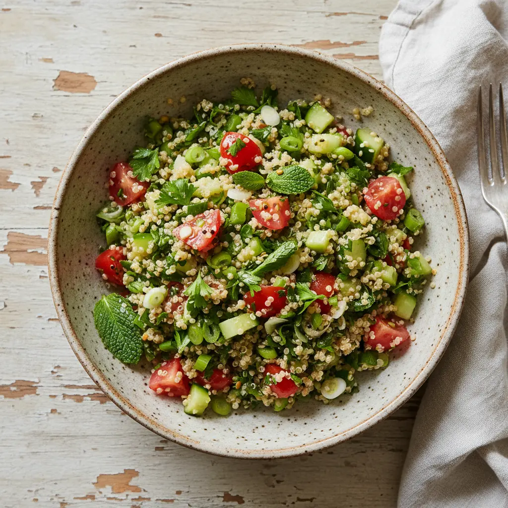 By substituting quinoa for bulgur wheat, the salad becomes a complete protein source, making it ideal for those following Mediterranean and anti-inflammatory diets. Packed with fiber-rich parsley, juicy tomatoes, and crunchy cucumbers, this salad is perfect as a side dish. To make this a complete meal add grilled haloumi, chicken or chickpeas.