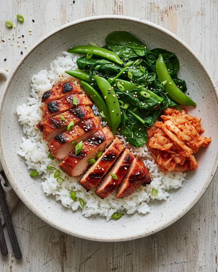 This easy rice bowl is perfect for a midweek dinner, giving a balanced lineup of spicy grilled chicken, sautéed greens, fluffy rice, and a punchy kimchi on the side. The build-a-bowl approach makes it both delicious and customizable, so make it your own or use up what's in the fridge!