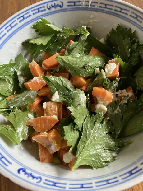In a large bowl, toss the with half of the to combine well. Transfer to a baking tray and roast in the oven for 20 minutes or until tender. Remove from the oven and allow to cool on a plate.